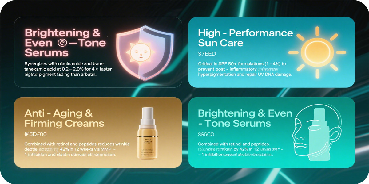• 0.1%-5% Blends: Optimized for brightening serums, sun care, and age-reversal formulations